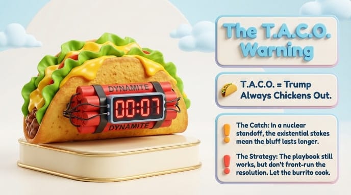 For most of 2025, this trade was a license to print money. It worked brilliantly on tariffs, on Venezuela, on every economic confrontation. But the Iran conflict is different in one critical way: the stakes are existential. Nuclear weapons. A sovereign nation with asymmetric retaliatory capabilities. Not a trading partner you can shame into a deal with tariffs.